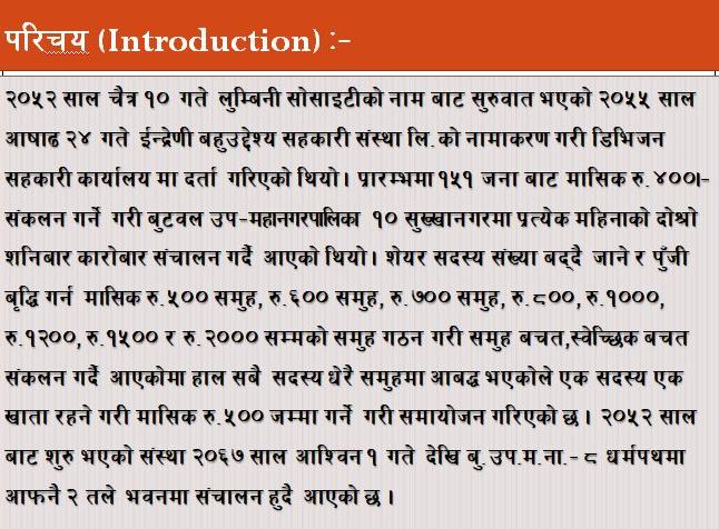 वि.सं. २०५२ सालको चैत्र महिनाको दोस्रो शनिबार देखि एक दिने १५१ जना सदस्यहरुबाट मासिक रु. ४०० ।– जम्मा गर्ने गरी बु.न.पा.–१०, सुख्खानगरमा लुम्बिनी सोसाइटीको नाममा श्री एक बहादुर राना ज्यूको नेतृत्वमा स्थापना भएको यस इन्द्रेणी बहुउद्देश्य सहकारी संस्था लिमिटेड २०५५ साल आषाढ २४ गते श्री भुपाल कुमार श्रेष्ठ ज्यूको नेतृत्वमा सहकारी कार्यालयमा वैधानिकता पाई विभिन्न समूह संचालन गर्दै बालबचत, शेयरसदस्यहरु बिच बैंकिङ कारोबार, मुद्दती निक्षेप संकलन सहित विभिन्न समुहगत बचत संकलन गर्दै आइरहेको छ । जस मध्ये ४००, ५००, ६००, ७००, ८००, १०००, १२००, १५००, २००० र एकमुष्ट ५००००।– का समुहहरु रहेका छन । ती समुहहरुमध्ये ४००, ५००, १०००, १५०० समुहका बचतकर्ताहरुलाई उक्त समुहले आर्जन गरेको ब्याज लाई विजयादशमीमा बचतका रुपमा वितरण गर्दै आएको छ । जुन रकमले विजयादशमीमा शेयर सदस्यहरुलाई धेरै सहयोग पुर्यााएको छ । बचतको अनुपातमा शेयरमा बृदि गर्दै, बचतलाई नियमितता गर्दा संस्थाप्रतिको लगावमा बढि प्रभावकारिता आउछ भन्ने मान्यता अनुसार बचत वितरण गरिरहेको समुहलाई एकत्रित गरी न्युनतम मासिक रु ५००।– जम्मा गर्ने गरी सबै समुहहरुलाई एकत्रित गरी नियमित बचत संचालन यही २०६८ आश्विन बाट थालिएको छ । शेयर र बचत गरेका रकम शेयर सदस्यहरुको आर्थिक विकासमा लगानी गर्नका साथै सामाजिक कार्यक्रममा बाढि पिडित सहयोग, छत्रवृत्ति वितरण,रक्तदान कार्यक्रम, जेष्ठ शेयर सदस्य सम्मान तथा मासिक भत्ता वितरण, पर्यावरण संरक्षण लगायतका क्षेत्रमा संस्थाले लगानी तथा सहयोग गरिरहेको छ । जग्गा क्षेत्रफल – ०–३–८ (तिन कठ्ठा आठ धुर) ठेगाना – बुटवल उप–महानगरपालिका– ८, धर्मपथ, रुपन्देही कार्यक्षेत्र – रुपन्देही जिल्ला दर्ता – १५२ (९४६) मिति – २०५५/०३/२४