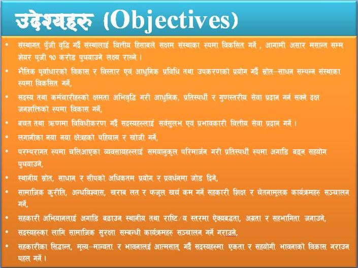 बचत तथा ऋणमा विविधीकरण गर्दै सदस्यहरुलाई सर्वसुलभ एवं प्रभावकारी वित्तीय सेवा प्रदान गर्ने ।